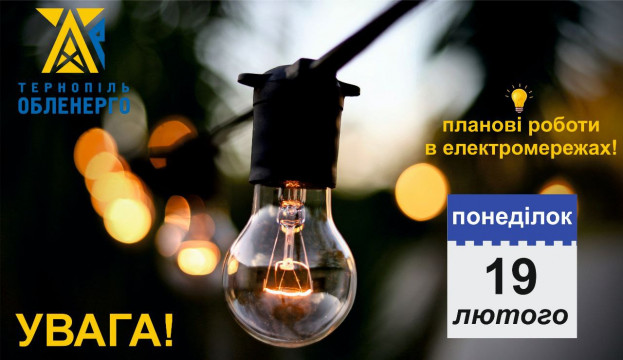 ВАТ «Тернопільобленерго» повідомляє, що сьогодні, 19 лютого, у зв’язку із виконанням ремонтних робіт на лініях електропередач та трансформаторних підстанціях відбудуться тимчасові перерви в електропостачанні деяких споживачів міста.