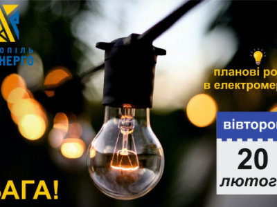 ВАТ «Тернопільобленерго» повідомляє, що сьогодні, 20 лютого, у зв’язку із виконанням ремонтних робіт на лініях електропередач та трансформаторних підстанціях відбудуться тимчасові перерви в електропостачанні деяких споживачів міста.