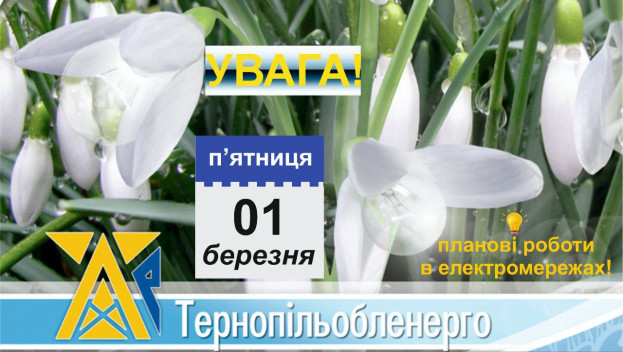 Більшість планових робіт в електричних мережах потребують попереднього знеструмлення обладнання. Сьогодні, 1 березня, буде тимчасово припинено електропостачання деяким споживачам нашої області.