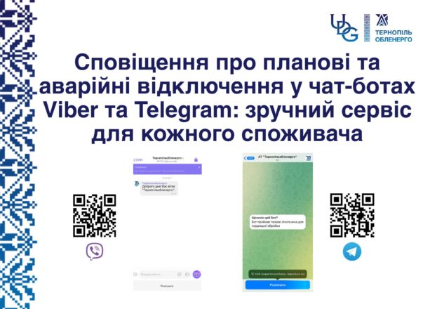 АТ «Тернопільобленерго» запровадило новий сервіс для побутових споживачів (населення). Відтепер сповіщення про планові та аварійні відключення електропостачання ви зможете отримувати у чат-ботах Viber та Telegram.