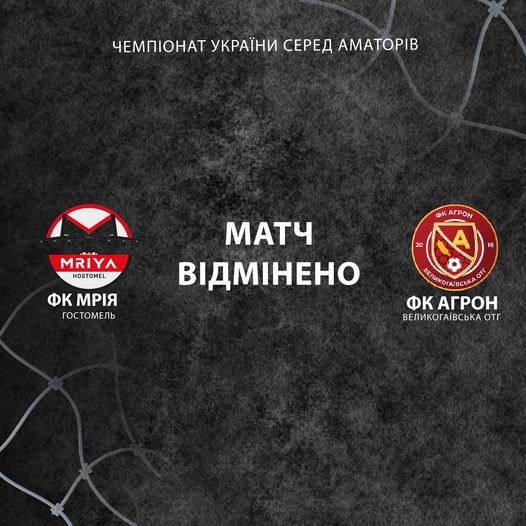 Матч 10-го туру аматорського чемпіонату України з футболу сезону-2024/25 між командами «Мрія» (Гостомель, Київська область) та «Агрон» (Великогаївська ОТГ, Тернопільська область), який був запланований на сьогодні, 10 листопада, у Гостомелі – не відбудеться.