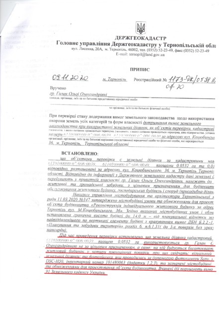 Як вдалося з’ясувати нашим журналістам, 19 грудня 2019 року Галан Ольга Олександрівна придбала індивідуальний житловий будинок на вулиці Михайла Коцюбинського, 36 загальною площею 263 кв. м, з яких житлової 130,6. Також за цією адресою жінкою було придбано дві земельні ділянки загальною площею 0,0656 га. Цільове призначення цих ділянок – для будівництва й обслуговування житлового будинку, господарських будівель і споруд. Будинок та земля знаходяться в зоні садибної житлової забудови, яка, відповідно до діючого плану зонування міста Тернополя, належить до зони Ж-1. Відповідно до державних будівельних норм, на зоні Ж-1 можна будувати житлові будинки до 4 поверхів включно з мансардним поверхом або зблокованих житлових будинків на сусідніх земельних ділянках.