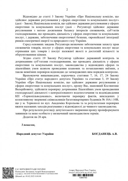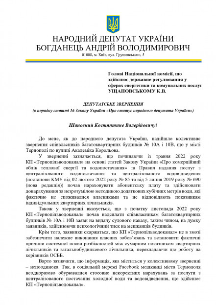 – Суми захмарні, кому 700, кому 1000, а кому й 1900 додаткових гривень. А тим, хто не погоджується з такою арихметикою, КП «Тернопільводоканал» оперативно надсилає копію заяви про видачу судового наказу, погрожуючи стягнути борг в судовому порядку. Зі скаргою на таку проблему, до мене звернулися співвласники багатоквартирних будинків по вулиці Академіка Корольова, хоча, як показують дописи у соцмережах, ситуація набула масового характеру. З метою з’ясування всіх обставин справи, направив депутатське звернення до КП «Тернопільводоканал» про надання пояснень з приводу інформації, викладеної у колективній скарзі. Також, звернувся до Н К Р Е К П з проханням здійснити відповідну перевірку. Чекаю на результати, про які я обов’язково проінформую тернополян, – зазначив Андрій Богданець і прикріпив копію звернення у відповіді інстанції.