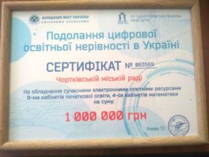Міський голова Чорткова Володимир Петрович Шматько завдяки своїй активній роботі, отримав сертифікат на обладнання сучасними електронними освітніми ресурсами восьми кабінетів початкової освіти та чотирьох кабінетів математики.