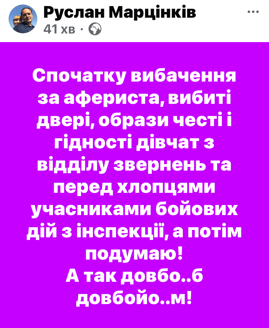 Спочатку вибачення за афериста, вибиті двері, образи честі і гідності дівчат з відділу звернень та перед хлопцями учасниками бойових дій з інспекції, а потім подумаю!