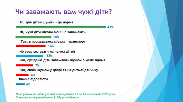 Загалом, 57% опитаних зазначили, що чужі діти їм не заважають. Натомість 27% відповіли ствердно. Лише 12% надали нейтральну відповідь і 4% не визначилися, що вказати. Що й казати, – цифри зовсім невтішні для суспільства, котре на словах спонукає жінок до народження дітей, і чим більше – тим краще, а згодом цькує їх на кожному кроці, поки ці діти не виростуть.