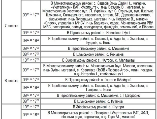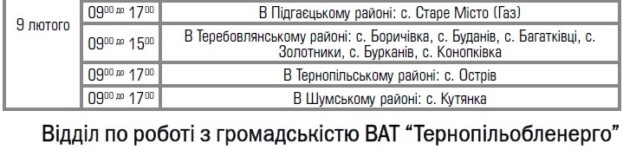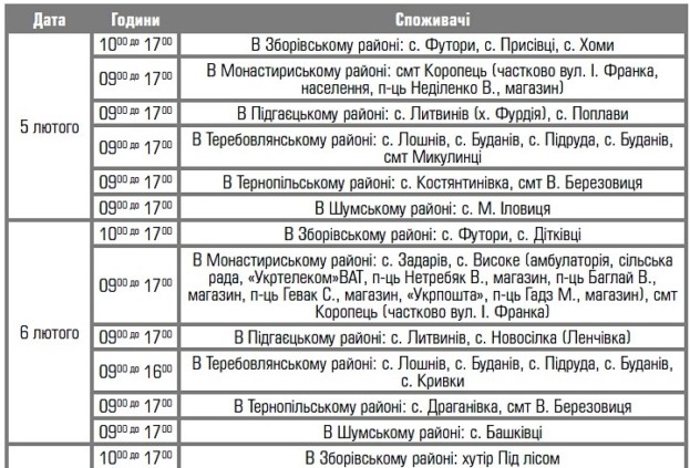ВАТ “Тернопільобленерго” повідомляє, що, у зв’язку з виконанням робіт із планових ремонтів обладнання трансформаторних підстанцій напругою 10/0,4 кВ і ліній електропередавання напругою 10 і 0,4 кВ з розчищенням їх трас та інших робіт з експлуатаційного обслуговування, буде тимчасово припинено постачання електричної енергії окремим споживачам.