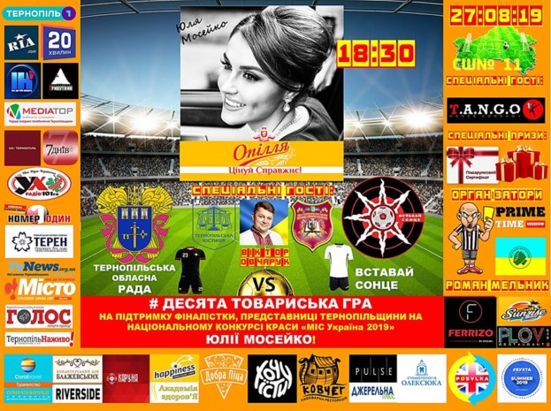 27.08.2019 року на штучному майданчику Тернопільської загальноосвітньої школи І-ІІІ ступенів №11(вулиця Генерала Мирона Тарнавського,6), за сприяння Павла Степановича Літинського о 1⃣8⃣:3⃣0⃣ між збірними * ▲Тернопільська Обласна Рада ▲ та збірною музикантів, ведучих, акторів, режисерів 🔺 ФК «Вставай Сонце»🔺відбудеться # десята товариська гра на підтримку фіналістки, представниці Тернопільщини на національному конкурсі краси “👸МІС УКРАЇНА 2019″ Julia Moseiko