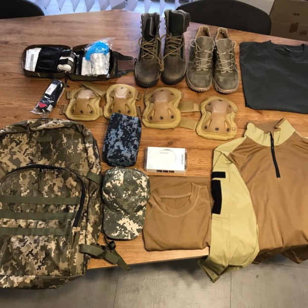 Наразі у нашому розпорядженні є літній варіант берців та тактичних кросівок, наколінники, тактична сорочка (убакс), футболка (хб), термофутболка, блайзер, медична аптечка, павербанк та додаткові підсумки.