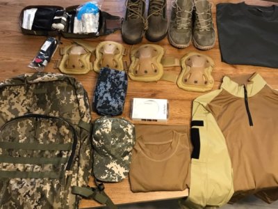Наразі у нашому розпорядженні є літній варіант берців та тактичних кросівок, наколінники, тактична сорочка (убакс), футболка (хб), термофутболка, блайзер, медична аптечка, павербанк та додаткові підсумки.