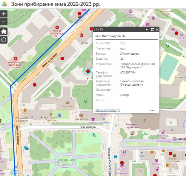 Дізнатись інформацію про виконавців робіт з утримання шляхово-мостового господарства м. Тернополя можна на інтерактивній карті відповідальності за зимове утримання міста 2022-2023рр.
