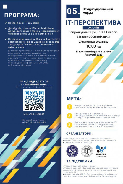 27 листопада 2022 року о 10.00 розпочнеться V Західноукраїнський форум «ІТ-перспектива» (ID zoom meeting: 339 812 3203, пароль: 2022), до участі запрошуємо учнів 10-11 класів загальноосвітніх шкіл.