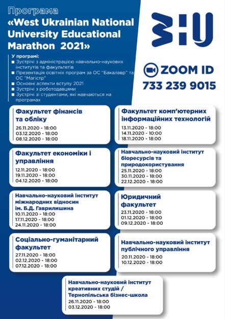 Ти випускник школи? Не знаєш, який університет обрати? Яка освітня програма найкраща для тебе? Візьми участь в онлайн-марафоні Західноукраїнського національного університету «Educational Marathon 2021» й дізнайся про особливості вступу, інститути та факультети, закордонне стажування, навчання за обміном, проживання в гуртожитках, іменні стипендії класичного університету Тернополя. Постав запитання й зроби свій вибір. Не зволікай! Ми чекаємо саме тебе! Будь особливим – обирай лідерів!