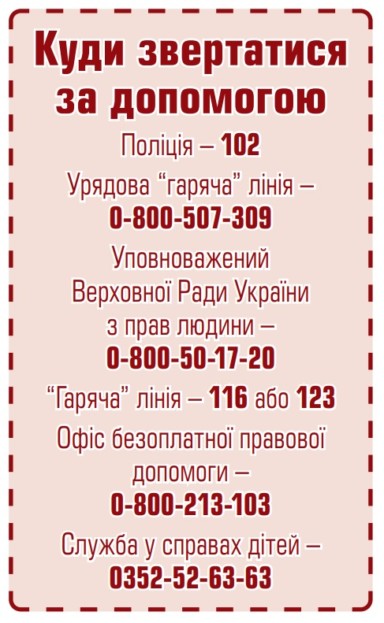У Тернополі існує безліч служб, куди можна звертатися потерпілим. До жінок, які потерпіли від насильства, особливе ставлення, з ними працюють психологи, соціальна служба, медики, їм допомагають відновитися та зажити нормальним, повноцінним життя. Важливо не мовчати про своє горе, а вчасно виявити кривдника, який сьогодні дарує квіти, а завтра для вас може не наступити…
