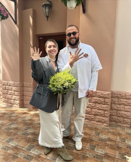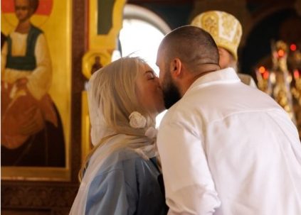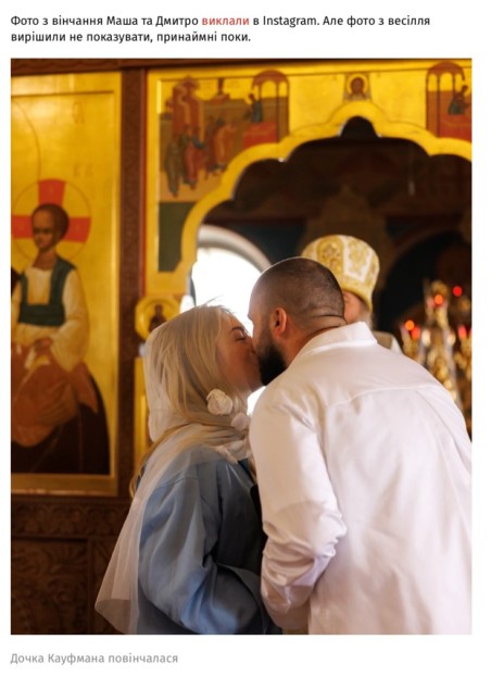 Офіційно пара побралася ще у травні, але лише зараз відбулося вінчання. Церемонія проходила у Свято-Успенській Почаївській лаврі, котра досі перебуває під московським патріархатом. Причому у Почаївській лаврі окопалися найбільш ортодоксальні прихильники російської церкви. Гостей на вінчанні було небагато. Пара виклала у Інстаграмі декілька фотографій з вінчання, але пізніше вони були видалені.