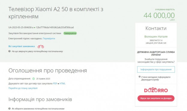 І вишенька на торті. 2 50-дюймові телевізори Xiaomi А2 50 в комплекті з кріпленням. 44 тисячі гривень. І знову закупівля без використання електронної системи.