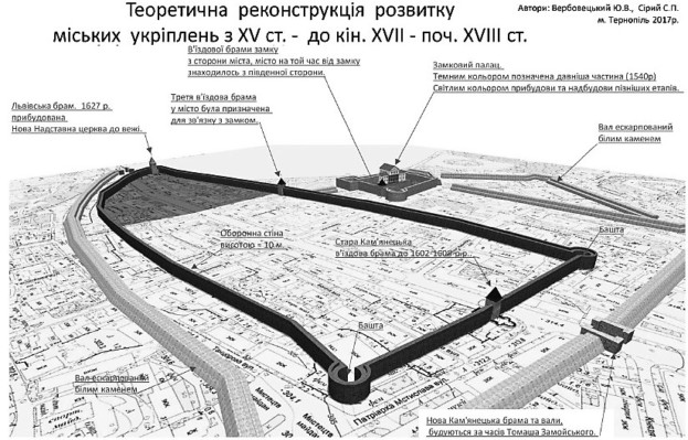 – В історії Тернополя допущено чимало помилок, які переписували з однієї книжки в іншу. Нові дослідження допоможуть спростувати деякі факти і з’ясувати нові. Для цього проектанти спершу визначили, як позначався Тернопіль на картах різних періодів. Маємо чимало варіантів карт і в кожному випадку Тернопіль позначався як укріплене місто – фортифікаційний об’єкт. На зображеннях можна чітко побачити кількість веж. Кожна позначка відтворювала, який об’єкт укріплений, а який – ні. Якщо в поселенні була церква, то позначали лише саму будівлю, без мурів. Якщо фортеця – то з укріпленням. Тобто було чітко показано, яким чином організована фортифікація. Відповідно до позначок, в’їзна брама (припускається, що вона була розташована поблизу пішохідного переходу до Тернопільського замку, – авт.) була величезних розмірів. Це було укріплення у вигляді прямокутника. Класична схема ведення оборони полягала в тому, щоб запускати ворога, який прорвався у місто, у замкнутий простір і вдарити по ньому вогнем. Згодом браму перемурували і в ній з’явилися єгипетські мотиви, – розповідає Леонід Бицюра.