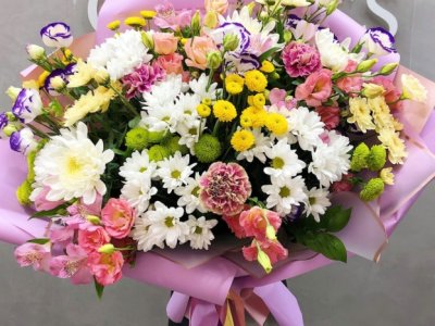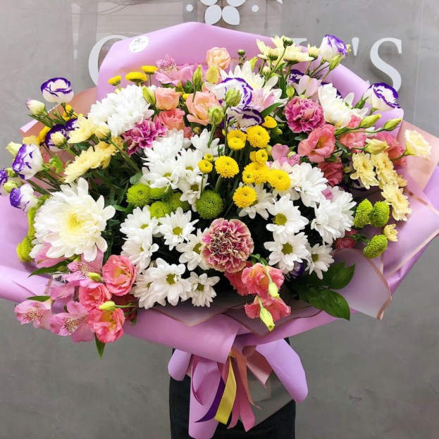 Цветочные композиции составляются опытными флористами со стажем не менее двух лет. Они могут быть выполнены из одного вида и оттенка цветов или сразу нескольких – лилий, роз, альстромерий, хризантем, подсолнухов, кал, и других растений. Они могут дополняться бесплатной поздравительной открыткой, шоколадными конфетами известных и популярных брендов, импортным алкоголем.