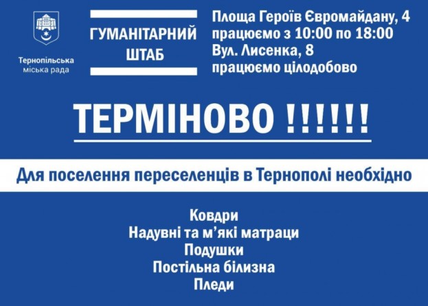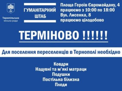 Активні громадяни та волонтери намагаються якомога швидше знайти прихисток для постраждалих. Станом ранок 08 березня, терміново для поселення переселенців у Тернополі необхідно: