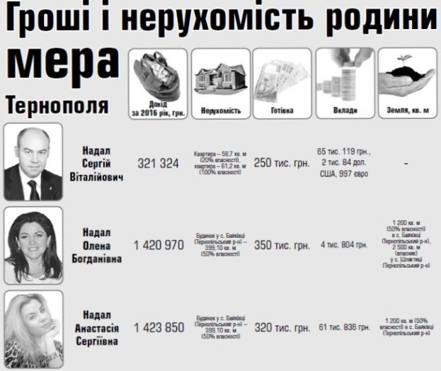 У попередньому випуску «Номер один» ми публікували детальний аналіз статків нардепів та ТОПових чиновників Тернопільщини. Серед них уважний читач не знайшов міського голови Тернополя Сергія Надала. Позаяк його декларації ми вирішили приділити особливу увагу та окрему публікацію.