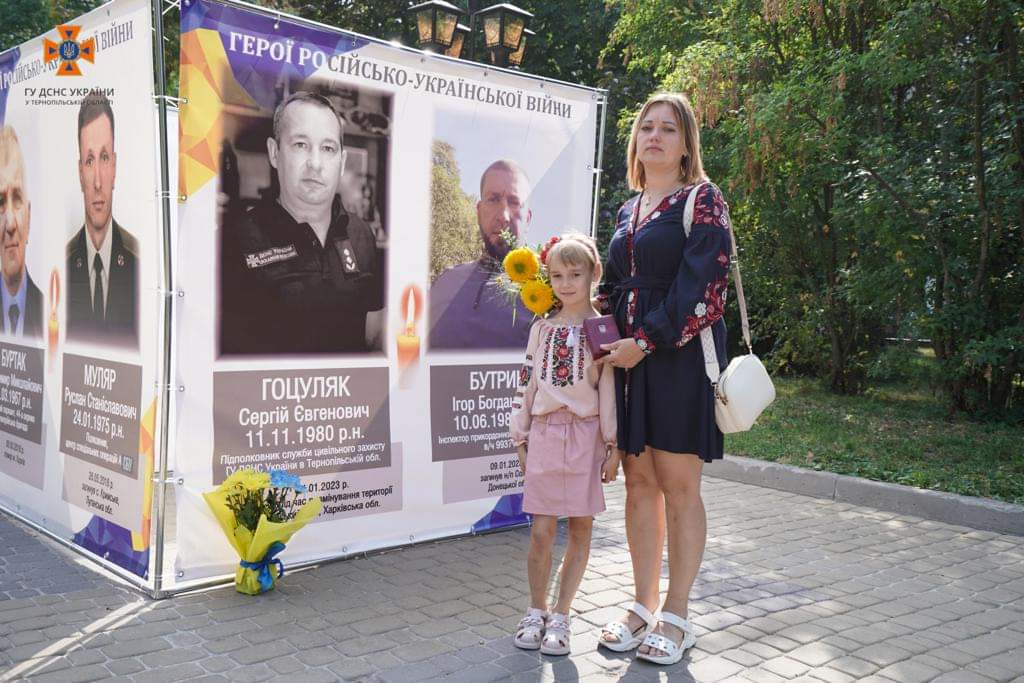 Сергій Євгенович ГОЦУЛЯК, начальник групи піротехнічних робіт спеціалізованої аварійно-рятувальної частини аварійно-рятувального загону спеціального призначення Головного управління ДСНС України у Тернопільській області, загинув 4 січня 2023 року, на Харківщині, під час виконання бойового завдання з розмінування деокупованої території. Сьогодні, 24 серпня, дружина загиблого героя Сергія Гоцуляка Ольга отримала орден «За мужність», ІІІ ступеня. Вручення нагороди відбулося у стінах Українського Дому «Перемога».