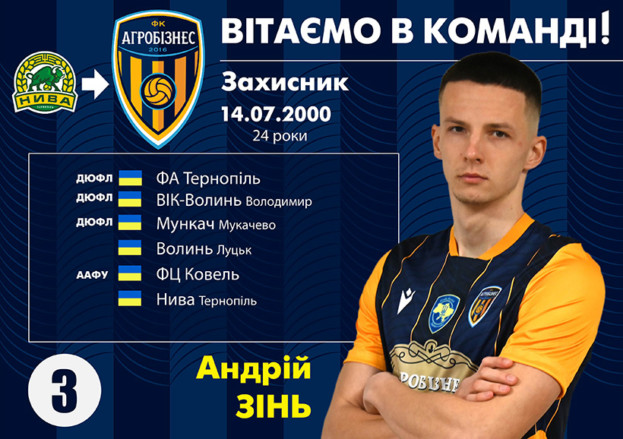 На початку січня стало відомо, що футбольний клуб «Нива» (Тернопіль) завершив співпрацю з захисником Андрієм Зінем та півзахисником Богданом Козаком. Як стало відомо, обидва гравці підписали контракти з ФК «Агробізнес» (Волочиськ, Хмельницька область), який, як і «Нива», виступає у першій лізі чемпіонату України.