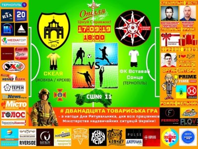17.09.2019р.  на штучному майданчику Тернопільської загальноосвітньої школи І-ІІІ ступенів №11(вулиця Генерала Мирона Тарнавського,6), за сприяння Павла Степановича Літинського о 18:00 між командою:▲СКЕЛЯ▲(Жовква/Крехів) та збірною музикантів, ведучих, акторів, режисерів 🔺 ФК «Вставай Сонце»🔺 відбудеться #дванадцята товариська гра з нагоди Дня Рятувальника, дня всіх працівників Міністерства Надзвичайних Ситуаціїй України!