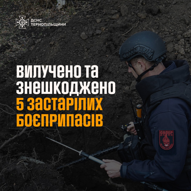 Протягом минулої доби піротехніки ДСНС України на Тернопільщині вилучили та знешкодили 5 боєприпасів часів минулих воєн.