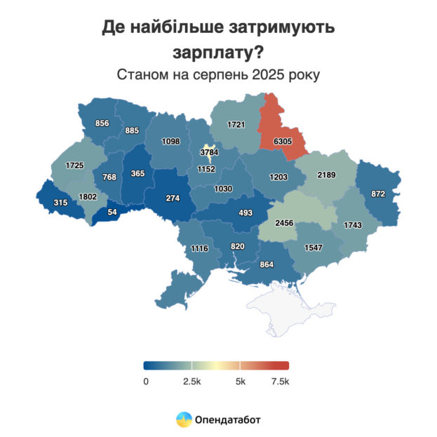 Найбільше заборгували підприємства у прифронтовій Сумській області — 6 305, на другому місці столиця — 3 784, на третьому — Дніпропетровщина з 2 456 провадженнями. На Тернопільщині відкрито 768 проваджень за невиплату зарплати.
