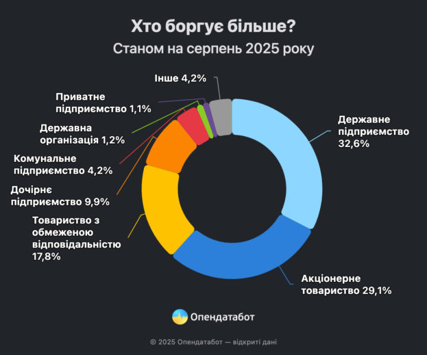 Найчастіше боржниками є державні підприємства — 11 562 (33%), акціонерні товариства — 10 308 (29%) та товариства з обмеженою відповідальністю — 6 298 (18%).