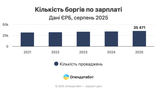 35 471 провадження щодо боргів по заробітній платі відкрито в Україні станом на початок серпня 2025 року. Це на 11% більше, ніж наприкінці 2021 року. Загалом 1 983 компанії заборгували своїм працівникам зарплату.