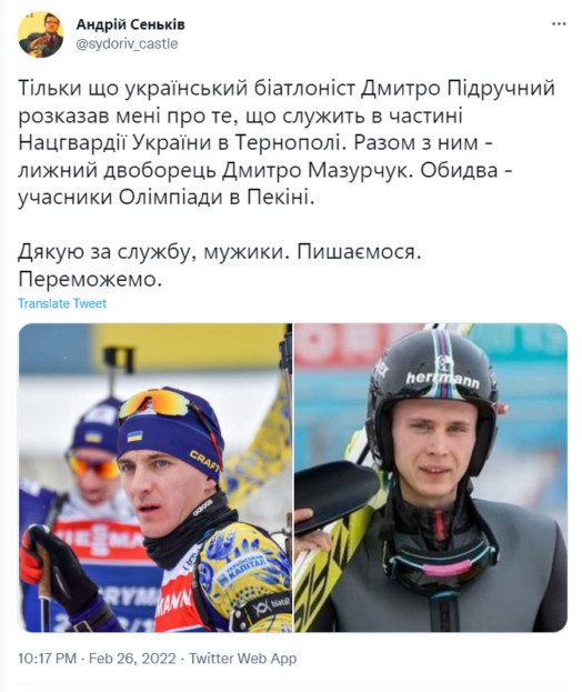 – Тільки що український біатлоніст Дмитро Підручний розказав мені про те, що служить в частині Нацгвардії України в Тернополі. Разом з ним – лижний двоборець Дмитро Мазурчук. Обидва – учасники Олімпіади в Пекіні (Китай). Дякую за службу, мужики. Пишаємося. Переможемо, – написав Андрій Сеньків у своєму Твіттері.