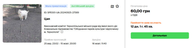 У Тернополі комунальне підприємство міськради продає на аукціоні цапа, віслюка і поні, а також баранів та вівцю, які живуть у міському зоокутку в парку “Сопільче”. Про це кореспонденту Укрінформу розповів директор комунального підприємства «Об’єднання парків культури і відпочинку міста Тернополя» Микола Ткач.