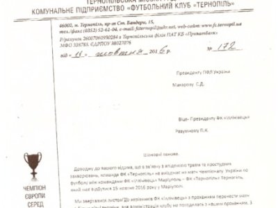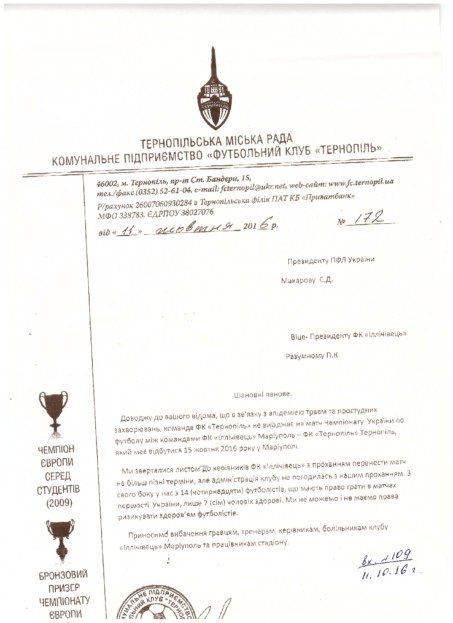 «Довожу до Вашого відома, що у зв’язку з епідемію травм та простудних захворювань, команда ФК «Тернопіль» не виїжджає на матч чемпіонату України між командами ФК «Іллічівець» – ФК «Тернопіль», який має відбутися 15 жовтня 2016 року. Ми зверталися листом до керівників ФК «Іллічівець» з проханням перенести матч на більш пізні терміни, але адміністрація клубу не погодилася з нашим проханням. Зі свого боку у нас є 14 футболістів, що мають право грати в матчах першості України, лише сім чоловік здорові. Ми не можемо і не маємо права ризикувати здоров’ям футболістів. Приносимо вибачення гравцям, тренерам, керівникам, вболівальникам клубу «Іллічівець» (Маріуполь) та працівників стадіону», – йдеться в офіційному повідомленні ФК «Тернопіль».
