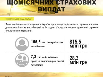 Щомісячні страхові виплати від Фонду соціального страхування України упродовж червня вже отримали 162,8 тисячі потерпілих на виробництві та членів їх родин.
