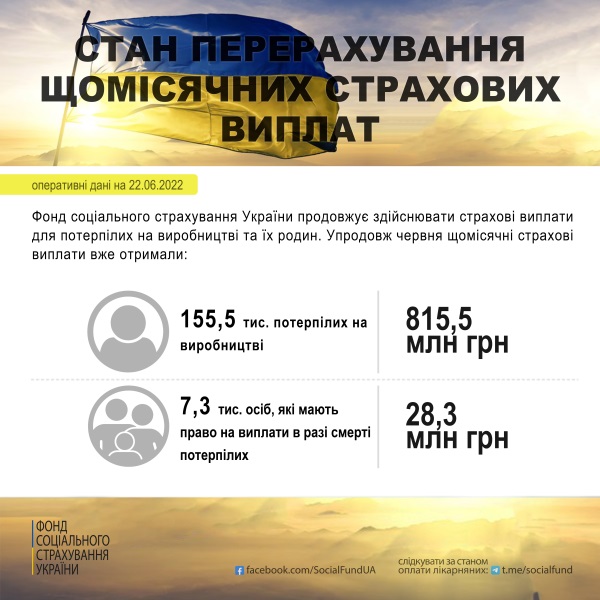Загалом станом на 22.06.2022 упродовж цього місяця було перераховано на банківські картки або доставлено листоношами 843,7 мільйона гривень щомісячних страхових виплат.