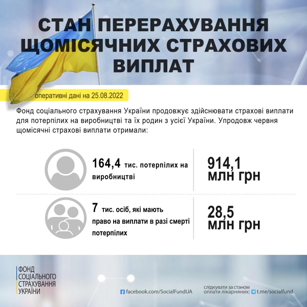 Щомісячні страхові виплати від Фонду соціального страхування України упродовж серпня вже отримали понад 170 тисяч потерпілих на виробництві та членів їх родин.