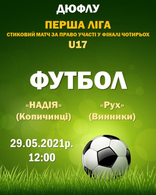 29 травня у Копичинцях відбудеться матч-відповідь серії плей-оф за вихід до фіналу “чотирьох” Дитячо-юнацької футбольної ліги України (перша ліга) у віковій категорії U-17. МІсцева команда “Надія” зустрічатиметься з “Рухом” з Винників (Львівська область). У першому поєдинку наші земляки святкували перемогу – 1:0.