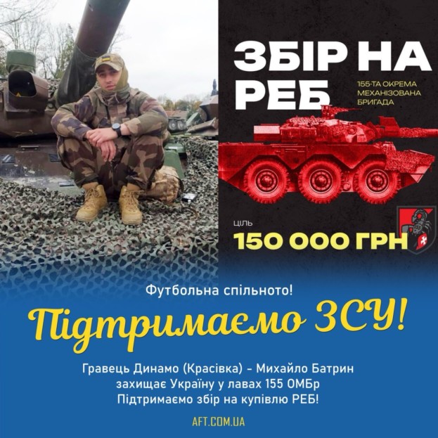 – Просимо Вас доєднатися до збору на купівлю РЕБ для 155 ОМБр, в лавах якої захищає Україну гравець команди “Динамо” (Красівка), постійний учасник районних змагань з футболу Михайло Батрин, – йдеться в повідомленні АФТР.