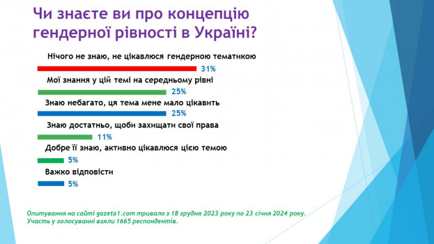 Загалом, 31% опитаних взагалі нічого не знають і не цікавляться гендерною тематикою. Ще 25% зізналися, що знають мало, бо тема їм не цікава. Водночас 16% добре володіють темою і вміють захищати свої права, а 25% оцінили свої знання на середньому рівні.