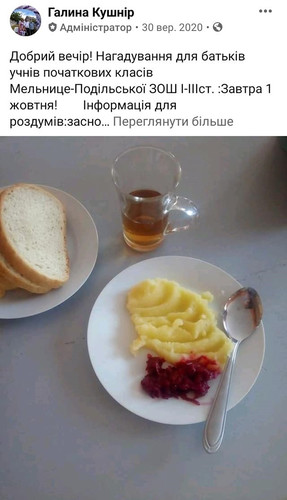 «Все затверджено: і котлети, і сарделька, і м’ясо, але на папері. Інколи це є, але двічі на місяць. Я своїх старших дітей просила їсти в школі на обід, а не в магазини ходити, але на цьому тижні один з них прийшов і до вечора мені розказував, яку дали підливку з м’яса: «Мамо, так тільки шкіри мелені і кишки!». Мабуть, був курячий фарш, я також колись купила, але з’їли коти, бо м’яса там не було. Але це платне харчування, це старша школа! А молодші класи і цього не получають. Старша школа за 15 грн. має котлету, салат і гарнір, а молодша – тільки гарнір і пластинку огірочка квашеного. Хоча оплата на 1 дитину майже та сама. Якщо я не помиляюсь, то 14 грн. коштує обід для молодших класів, але меню зовсім не те», – доповнила допис Тетяна Костенюк.