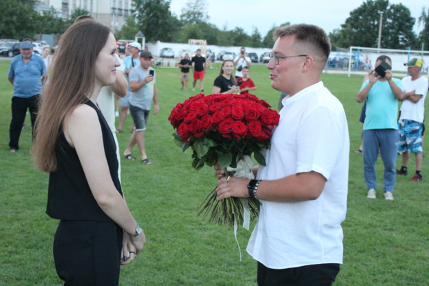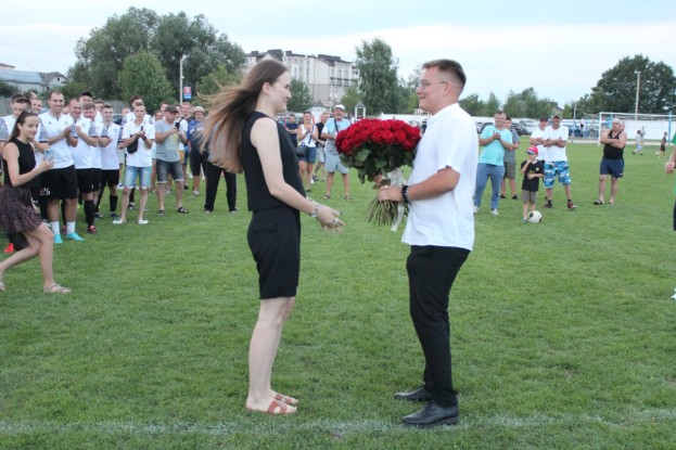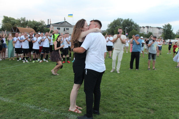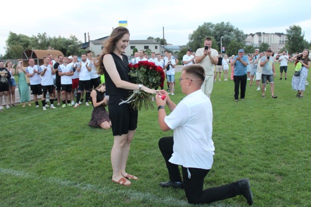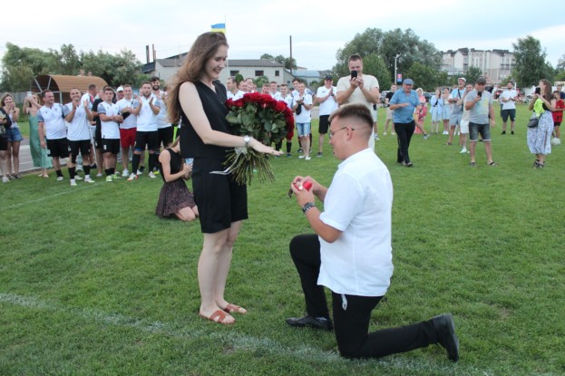 Голова Озернянської громади Назар Романів вийшов до місця для урочистостей з величезним букетом троянд. Через кілька секунд Назарій реалізував свій сюрприз. На футбольний газон стадіону він запросив свою кохану Вікторію, якій на повному людей стадіоні зробив пропозицію руки і серця.