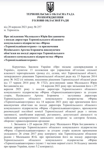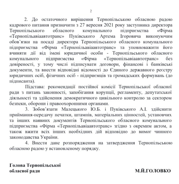 Від сьогодні, 25 вересня, з посади директора Тернопільського обласного комунального підприємства «Фірма «Тернопільавіаавтотранс» звільнено Юрія Малецького, який у другому своєму приході обіймав цю посаду з січня 2017 року, натомість з понеділка, 27 вересня, виконувати обов’язки директора аеропорту буде Артем Ігорович Пуківський.
