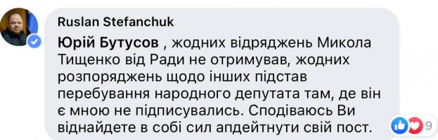 Виявляється, поїздка Тищенка в Азію під час війни в Україні була незаконною, адже він не отримав дозволу на відрядження від голови Верховної Ради. Про це сам спікер парламенту, уродженець Тернополя Руслан Стефанчук написав у коментарі відомому журналісту Юрію Бутусову.