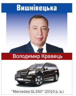 Великий автопарк і у родини керівника Вишнівецької селищної громади Володимира Кравця, що й не дивно, адже чоловік – ексочільник приватного агропромислового підприємства «Добрий самарянин». Відтак у чиновника у власності перебувають 4 автомобілі: «Mercedes GL350» 2010 р. в. (23 тис. доларів), «Audi A8» 2000 р. в. (6 тис. доларів), «MAN TGX 18.440» 2010 р. в. (15 тис. доларів), «Renault Trafic» 2011 р. в. (13 тис. доларів).