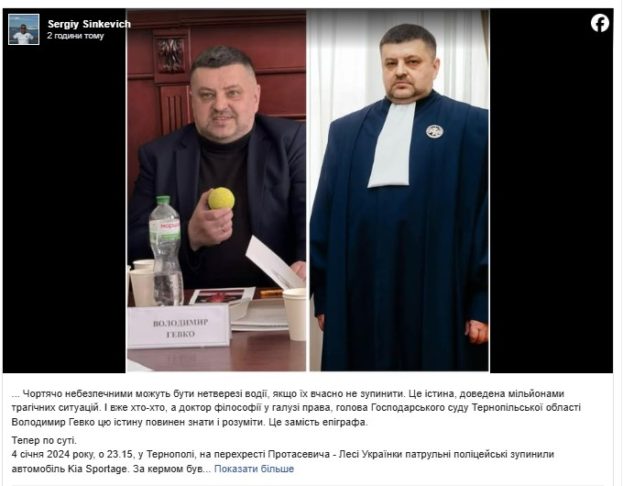 Журналіст Сергій Сінкевич оприлюднив інформацію про дисциплінарну скаргу щодо голови Господарського суду Тернопільської області Володимира Гевка, пов’язану з фактом керування автомобілем у стані алкогольного сп’яніння.