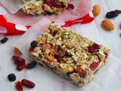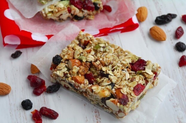 3. Родзинки і в’ялену журавлину промити, старанно обсушити і додати до злаків. Перемішати, щоби всі складові рівномірно розподілилися.