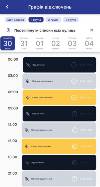 Після цього, у відповідності до обраної вулиці, ви побачите графік відключень світла. Переглядати інформацію можна як за групами, так і за різними адресами (для цього необхідно редагувати поле обраної вулиці).
