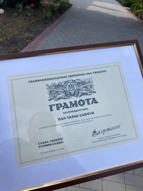 Головнокомандувач збройних сил України, генерал Валерій Залужний нагородив грамотою пана Тараса Савчука за активну громадянську позицію, патріотизм та допомогу Збройним силам України, що наближує Перемогу над ворогом.