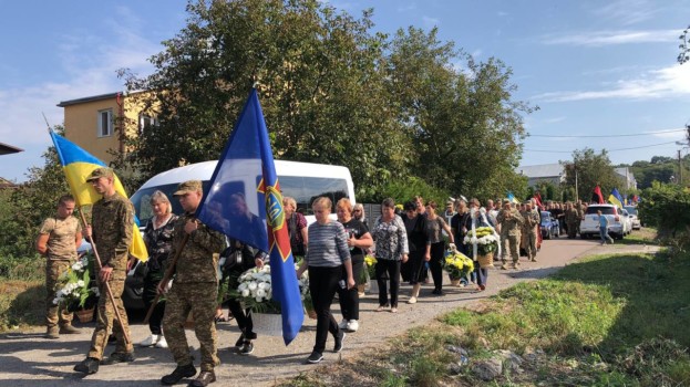 З церкви рушили на цвинтар по останній блаженній дорозі до тихої пристані і місця спочинку загиблого Героя під спів Трисвятого й похоронного маршу. На всю округу тужливо розносився звук церковного дзвону. З гордим смутком домовину супроводить велика українська родина, що розділяє біль втрати і смуток кожного…